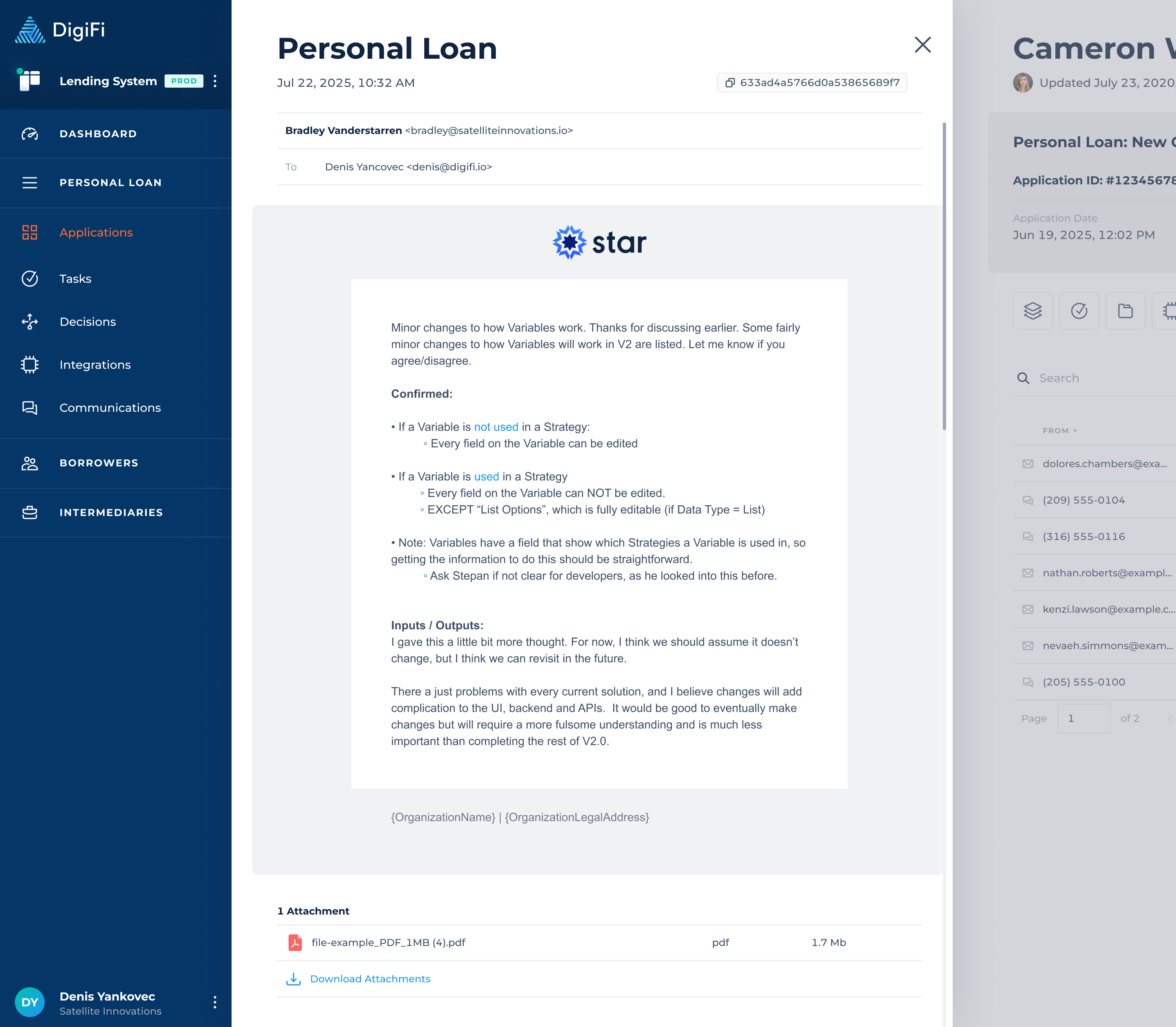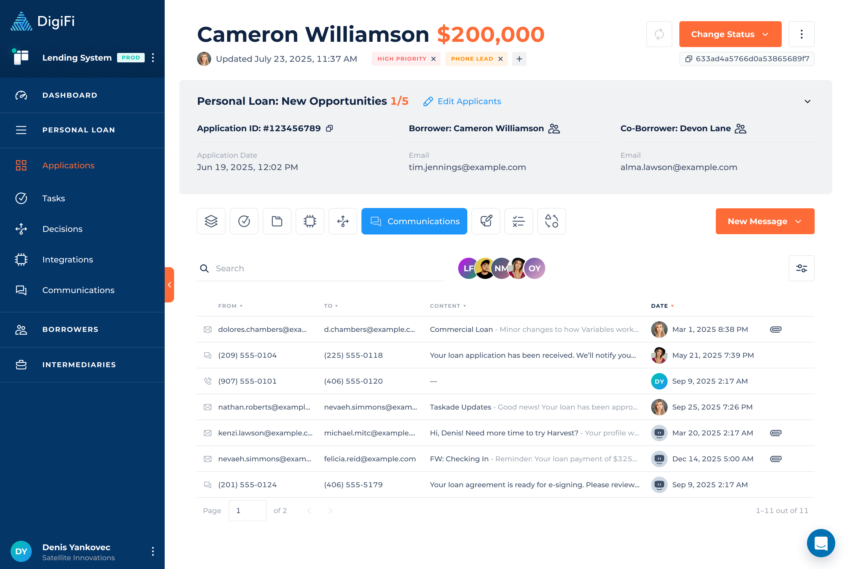 The DigiFi platform provides a unified communications tracking system that lets you view all application-related emails, text messages, and phone calls in one place. This includes: