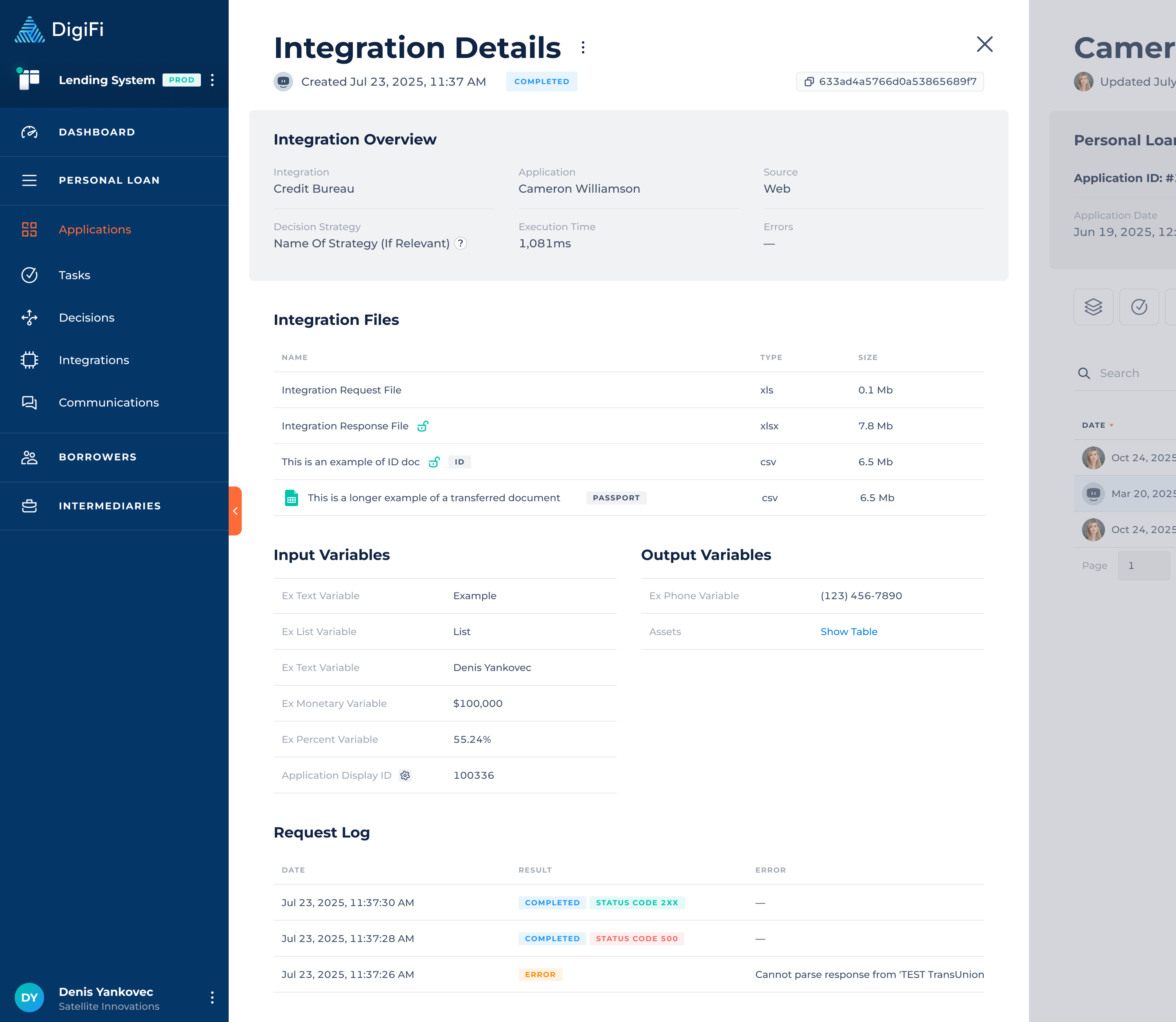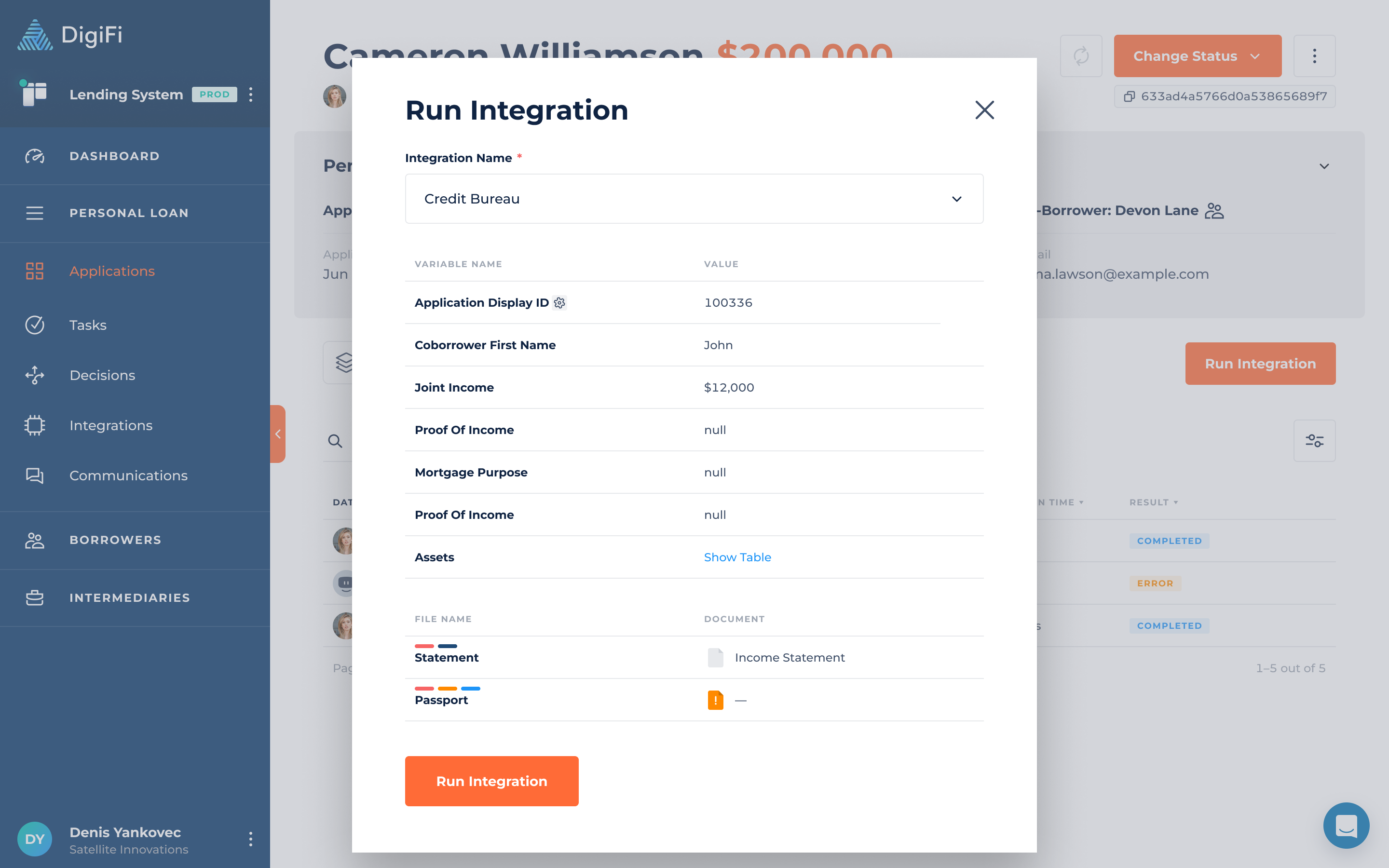 Once a data integration has been set up by your platform administrator, you can run it using the variables (i.e. data fields) stored on the application as inputs. The variables generated as outputs will be automatically saved back to the application. This lets you easily retrieve data and use it in the lending process.