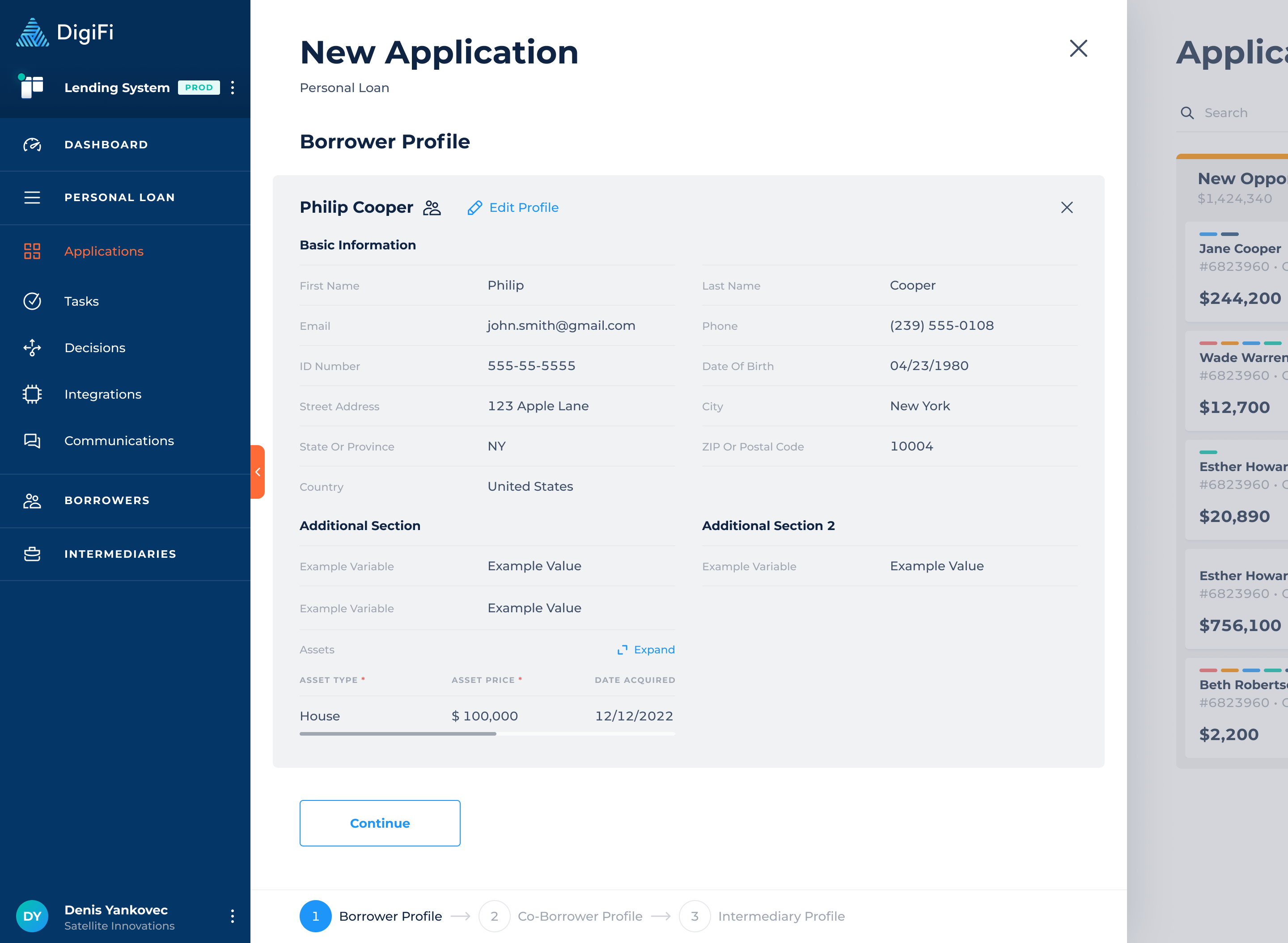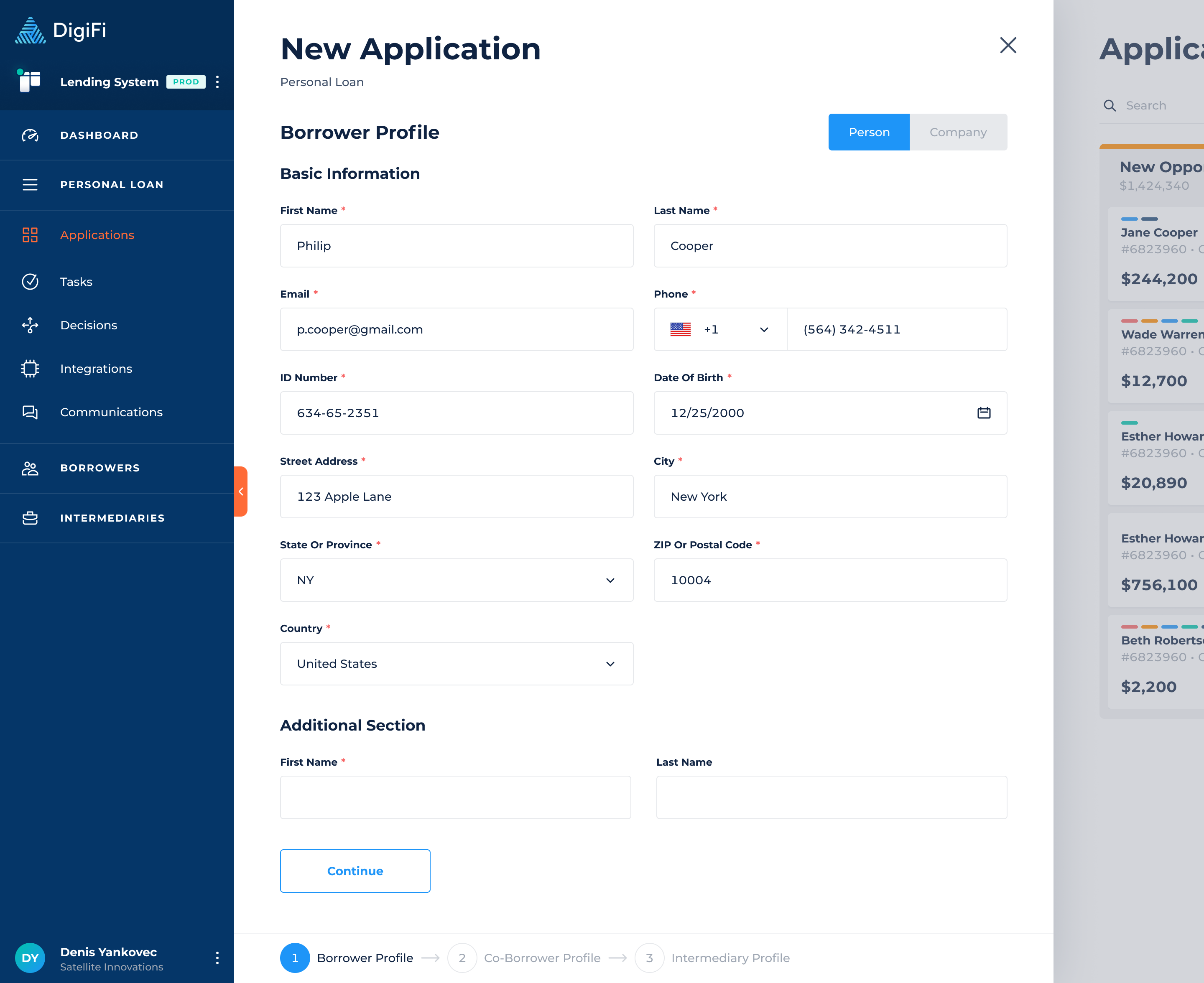 The first page of the application form is the borrower's profile (either for a person or company), where you provide information about the primary applicant. Every application in the DigiFi platform is tied to at least one borrower, and a single borrower can be tied to many applications. As part of the new application process you will have to either select an existing borrower or create a new one.