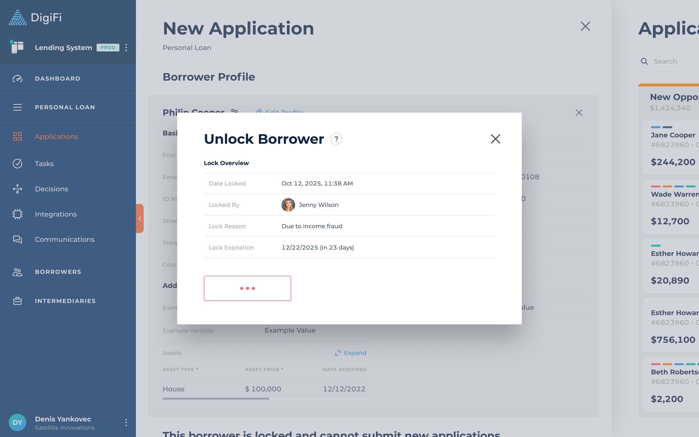 Existing borrowers may be "Locked" and unable to apply, in which case a message will appear letting you know. This typically occurs when they have applied recently, but could also be because one of your team members decided to block them from new applications (e.g. suspected fraud or identity theft). If the borrower is Locked, you'll have the option to view the reasons they were locked and, if appropriate, unlock them.