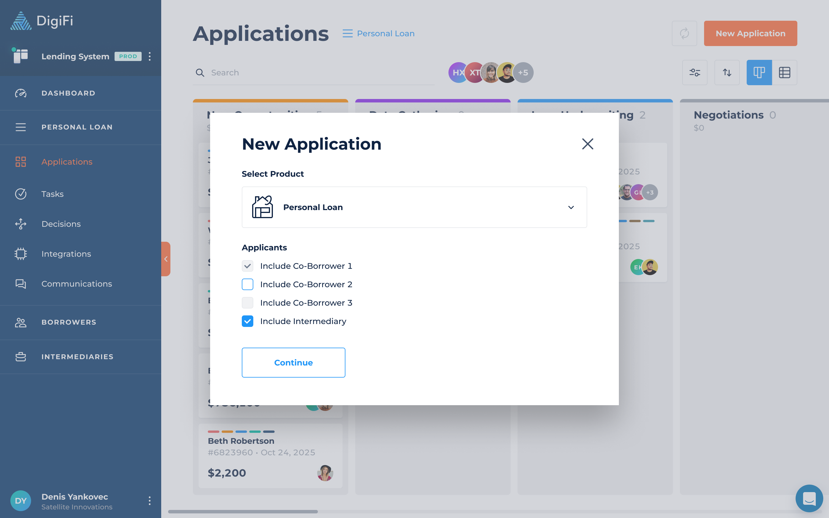- A popup will appear where you can select the loan product for the application from the dropdown list, and toggle co-borrower(s) and intermediary on or off, if they are configured in the Loan Product.