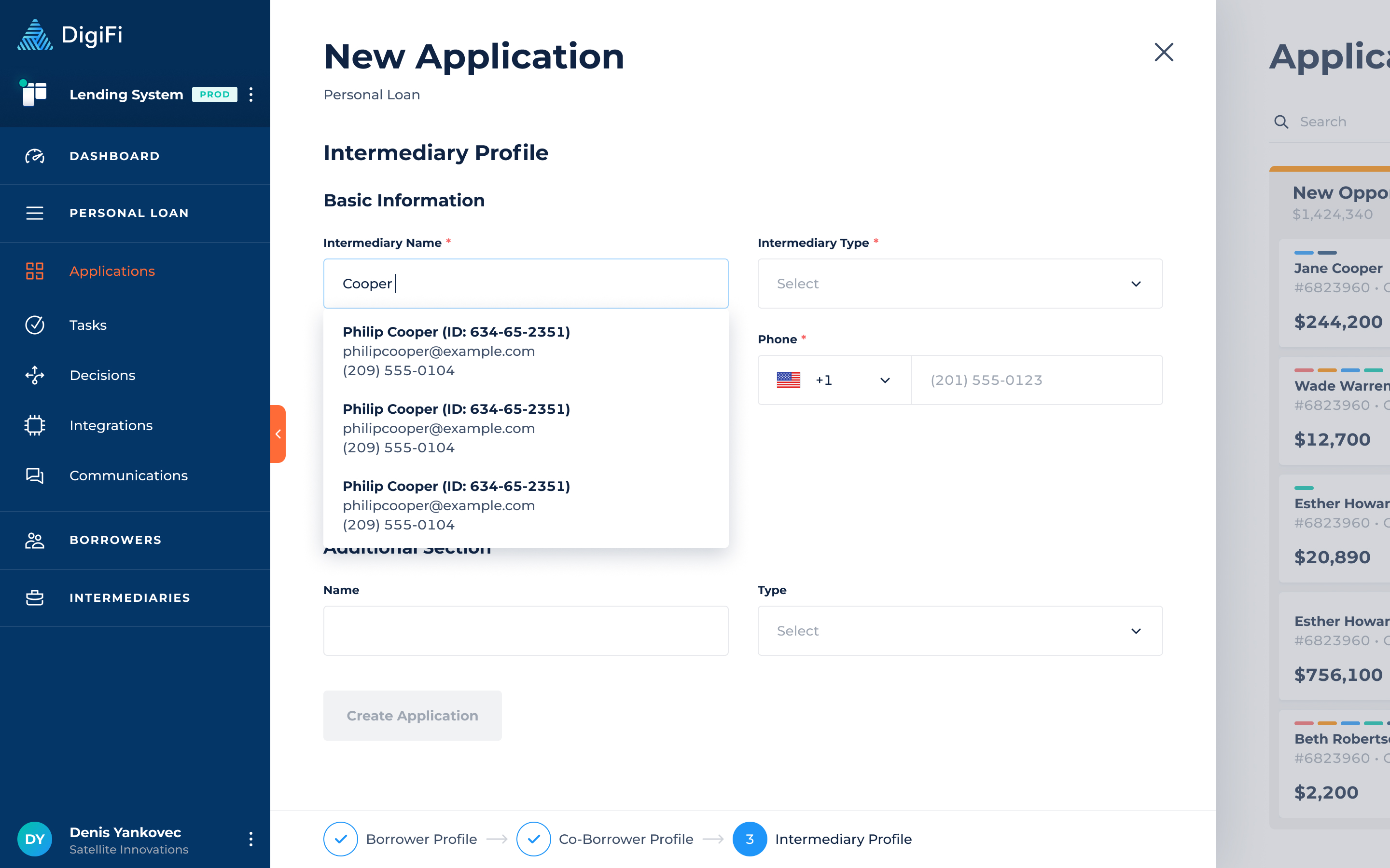 If the applicant has previously applied, they will be treated like an existing borrower. You'll be able to find them by typing their basic information (e.g. name, email, date of birth, phone number, identification number) and selecting the correct person or company. You then have the option to edit their information by clicking the "Edit Profile" button.