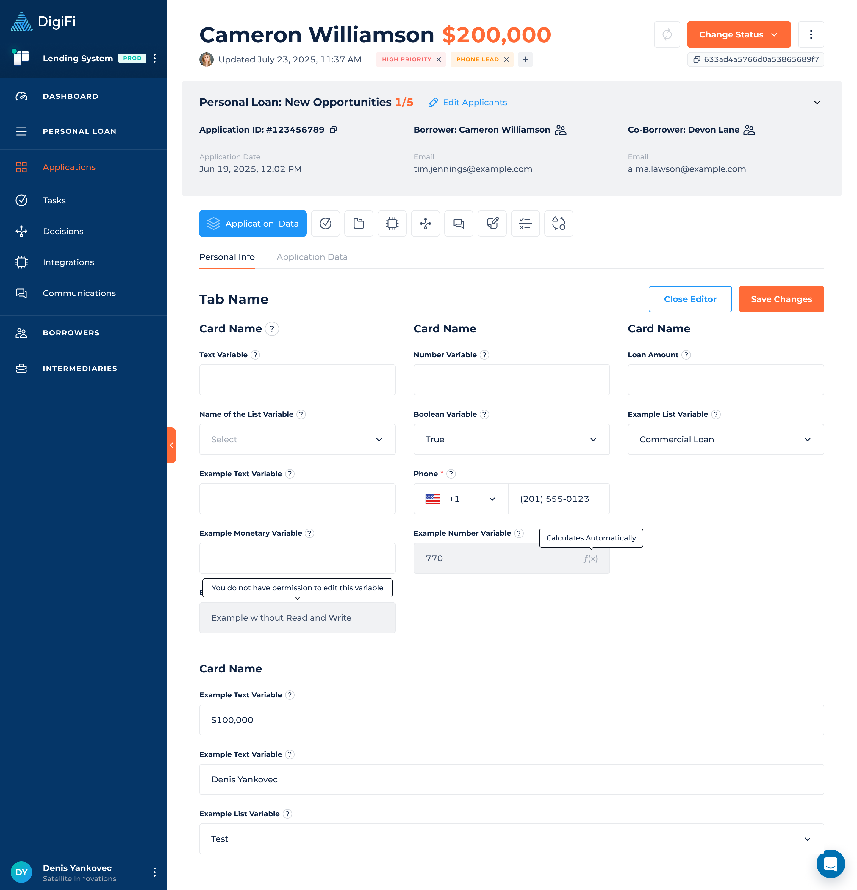 If your loan product includes calculated variables, these will automatically update as well. If there are required variables, you won’t be able to save changes until those variables have values. If you have variables with conditional formatting, you will see them highlighted both in the application and in the editor mode.