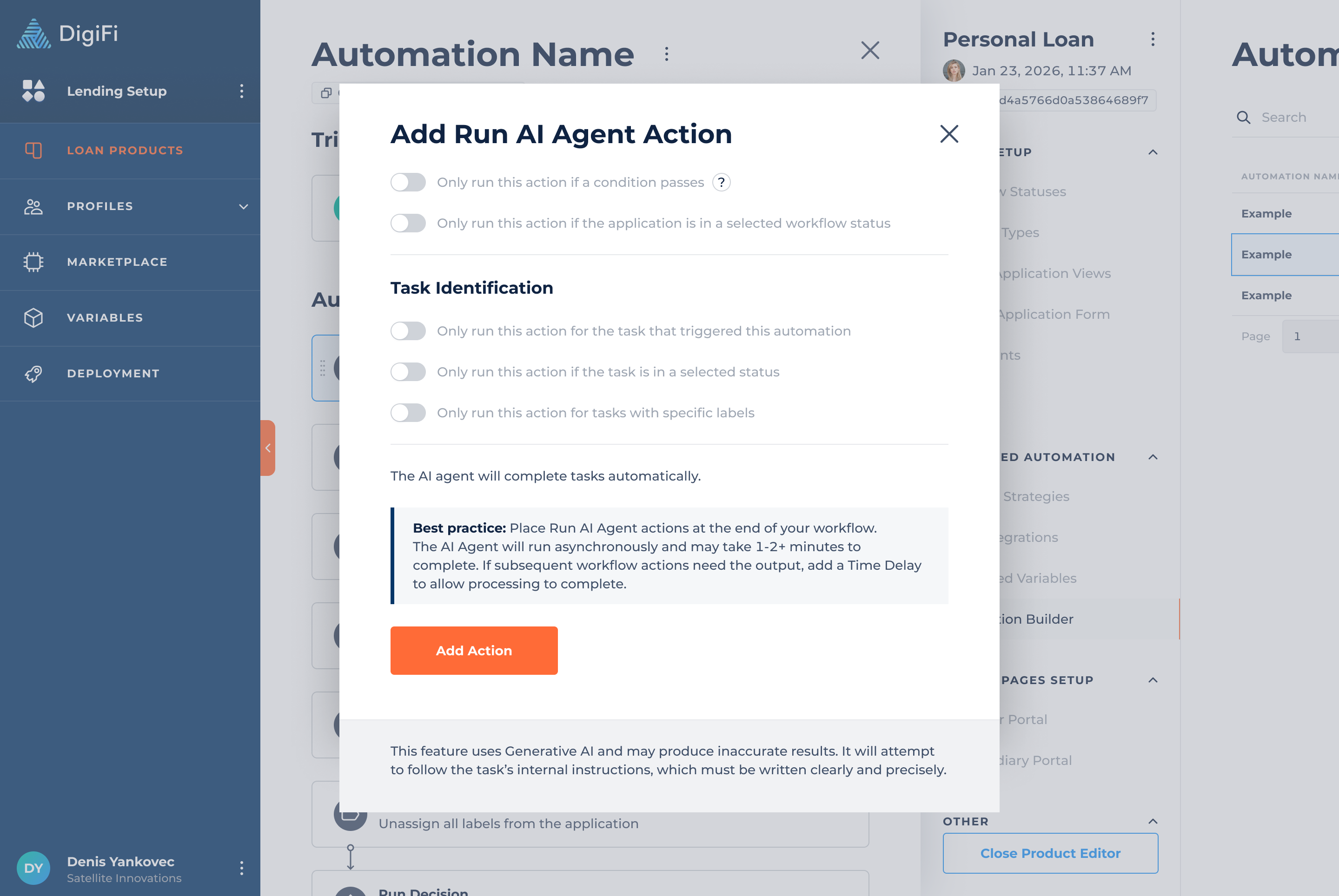 The "Run AI Agent" action allows you to automatically execute the DigiFi AI Agent on a defined task within your workflow.