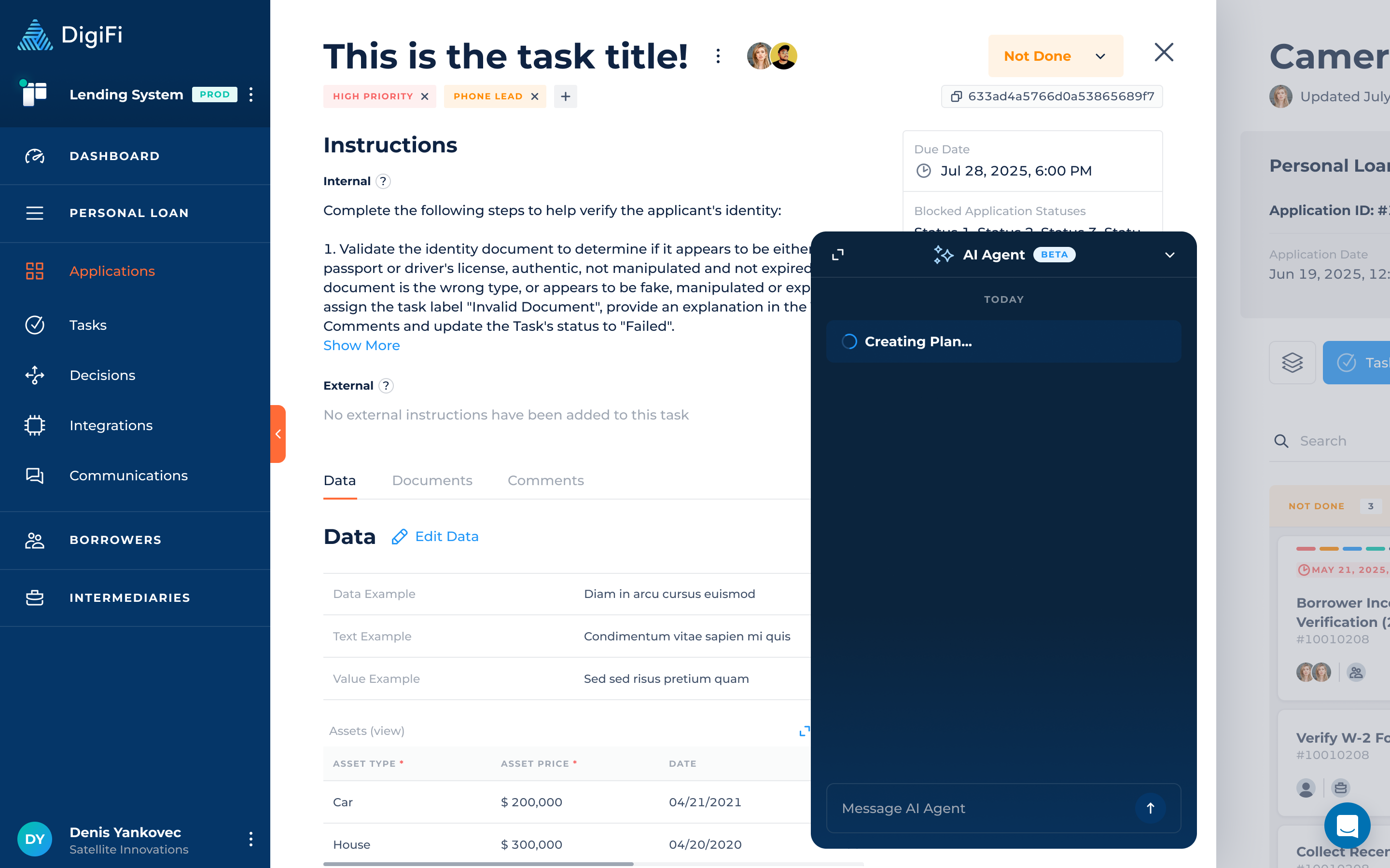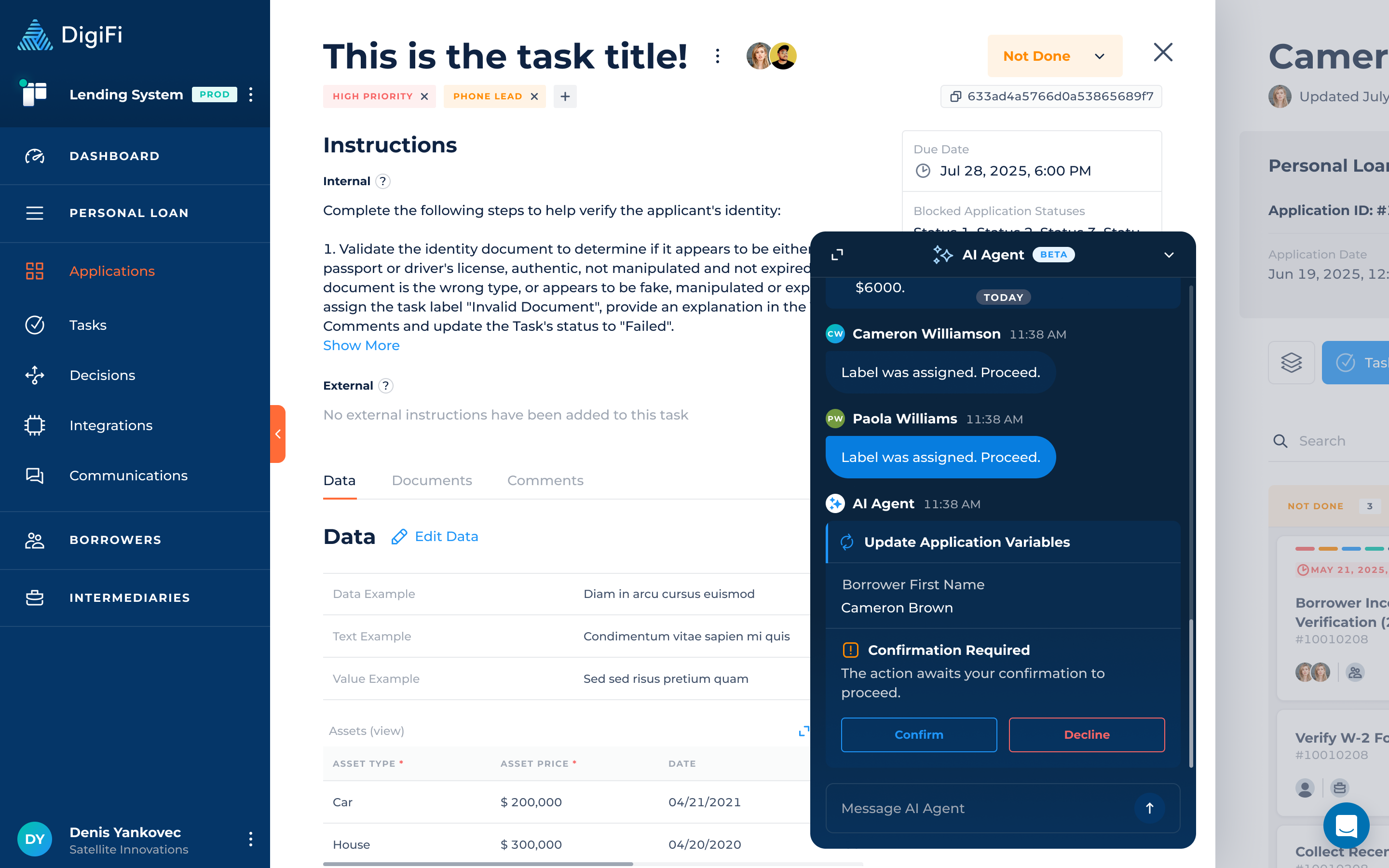 The DigiFi platform features a built-in AI assistant that helps your team streamline the review and completion of application tasks using generative AI.