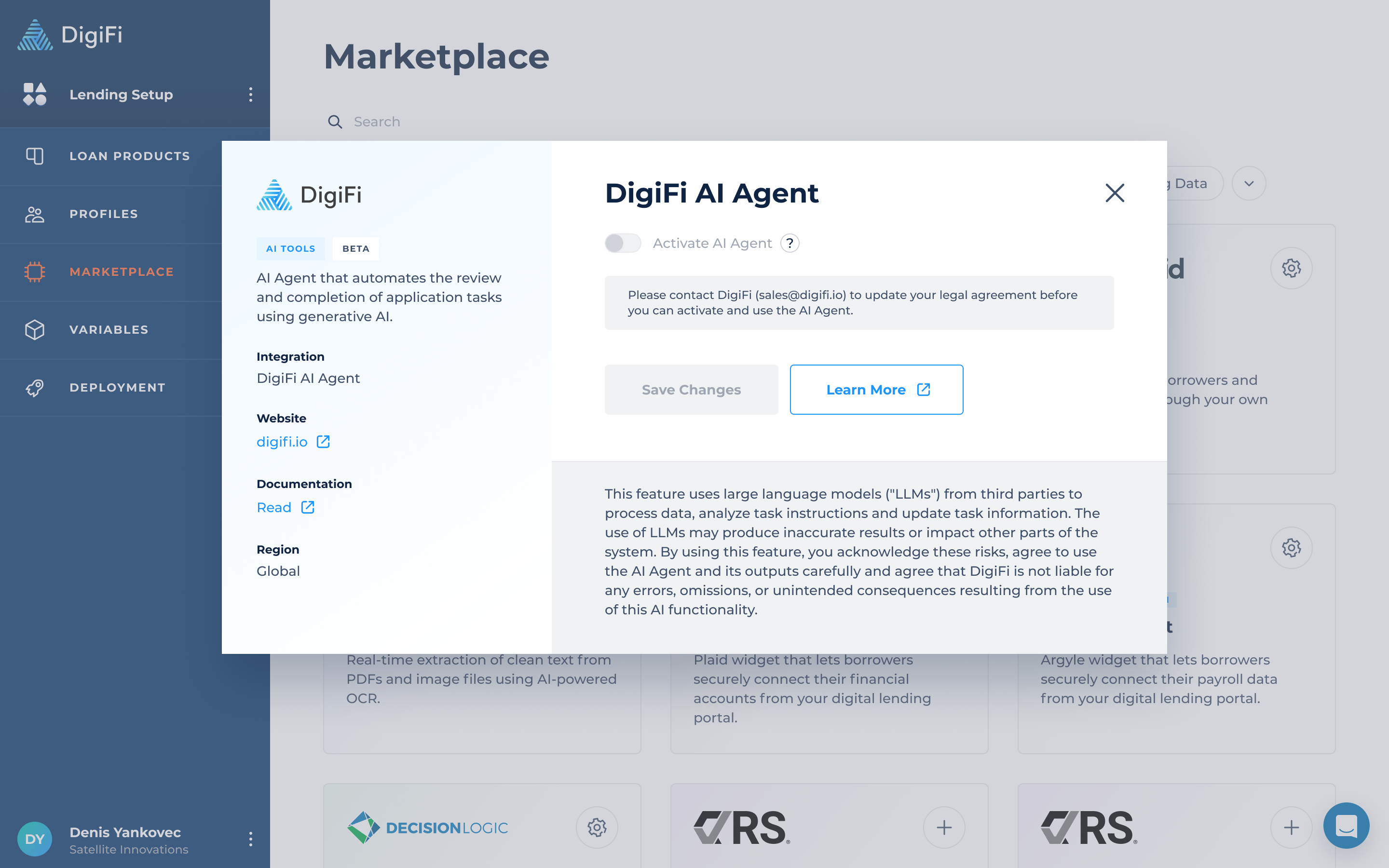 The AI Agent can be found in the DigiFi Marketplace under the AI Tools category. Simply enable the toggle to activate the agent.