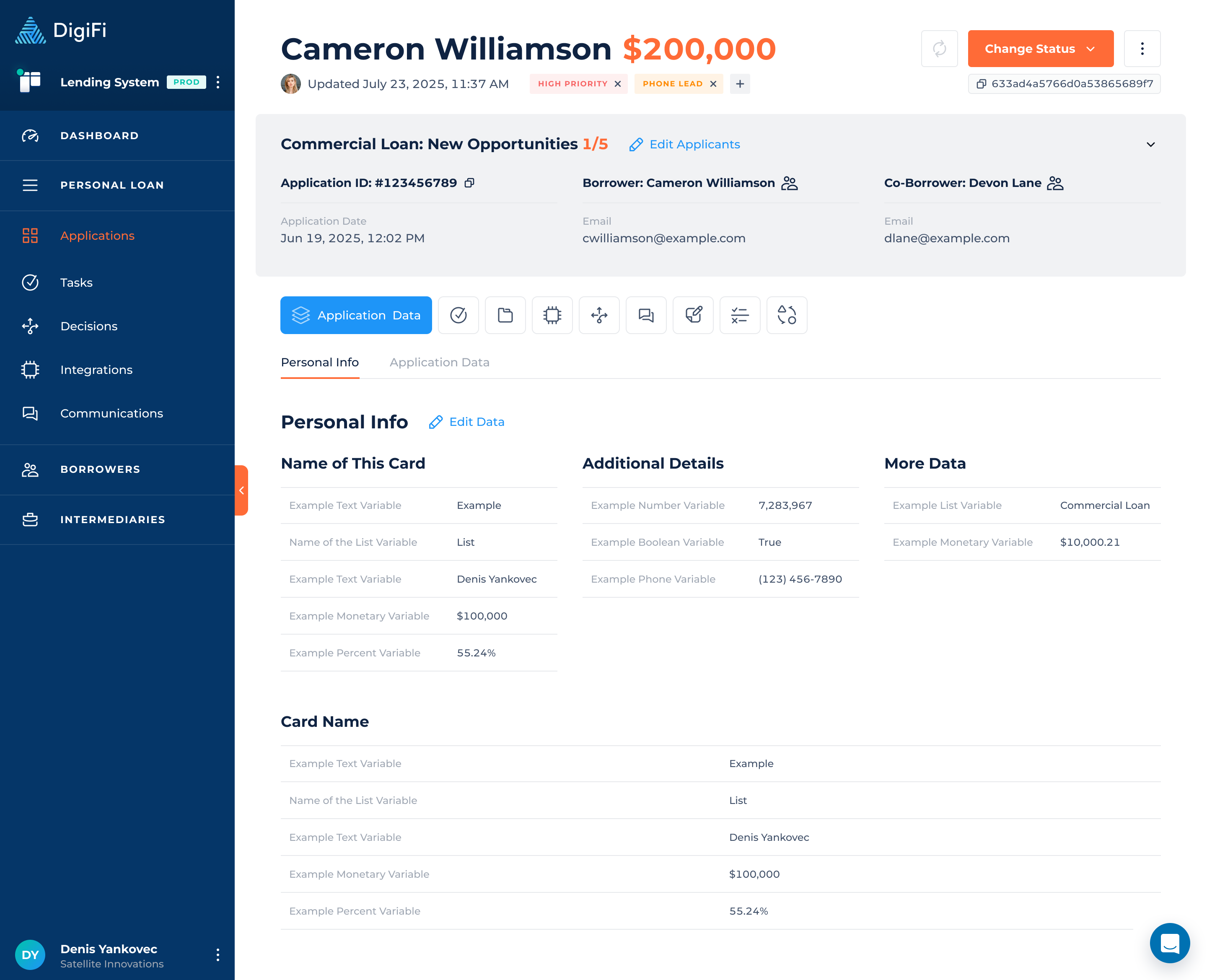 An application is created every time a borrower applies for a loan in the DigiFi platform and can contain data, documents, underwriting results, integration data, verification details, processing information and more. DigiFi provides extensive capabilities to help lending teams process applications accurately and efficiently.