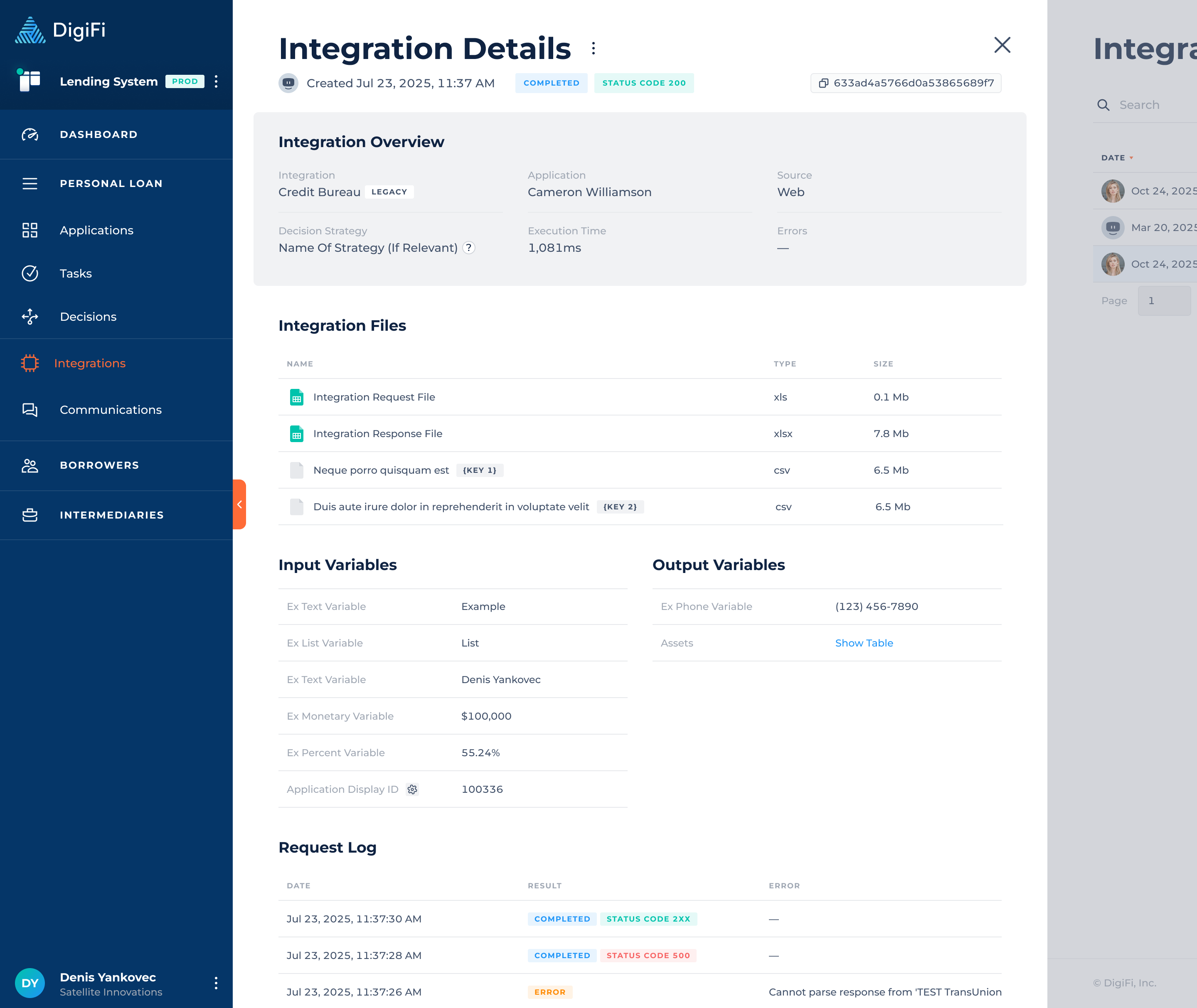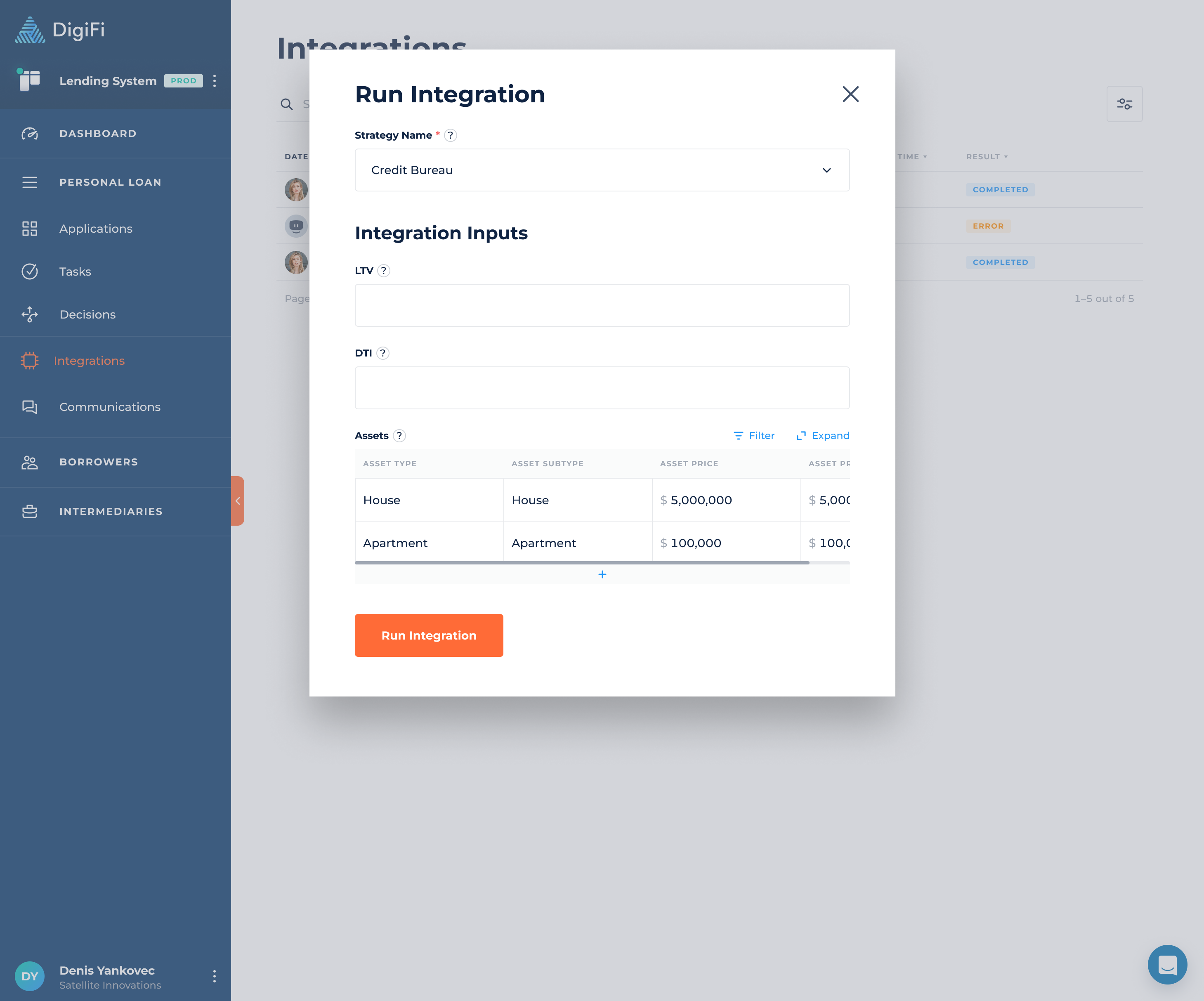 The “Integrations” section includes the results of all integrations that have been executed within a specific loan product across all applications. From here you can find the integrations that were run by team members through the DigiFi user interface, automatically through automation builder processes and by external systems using DigiFi's API.