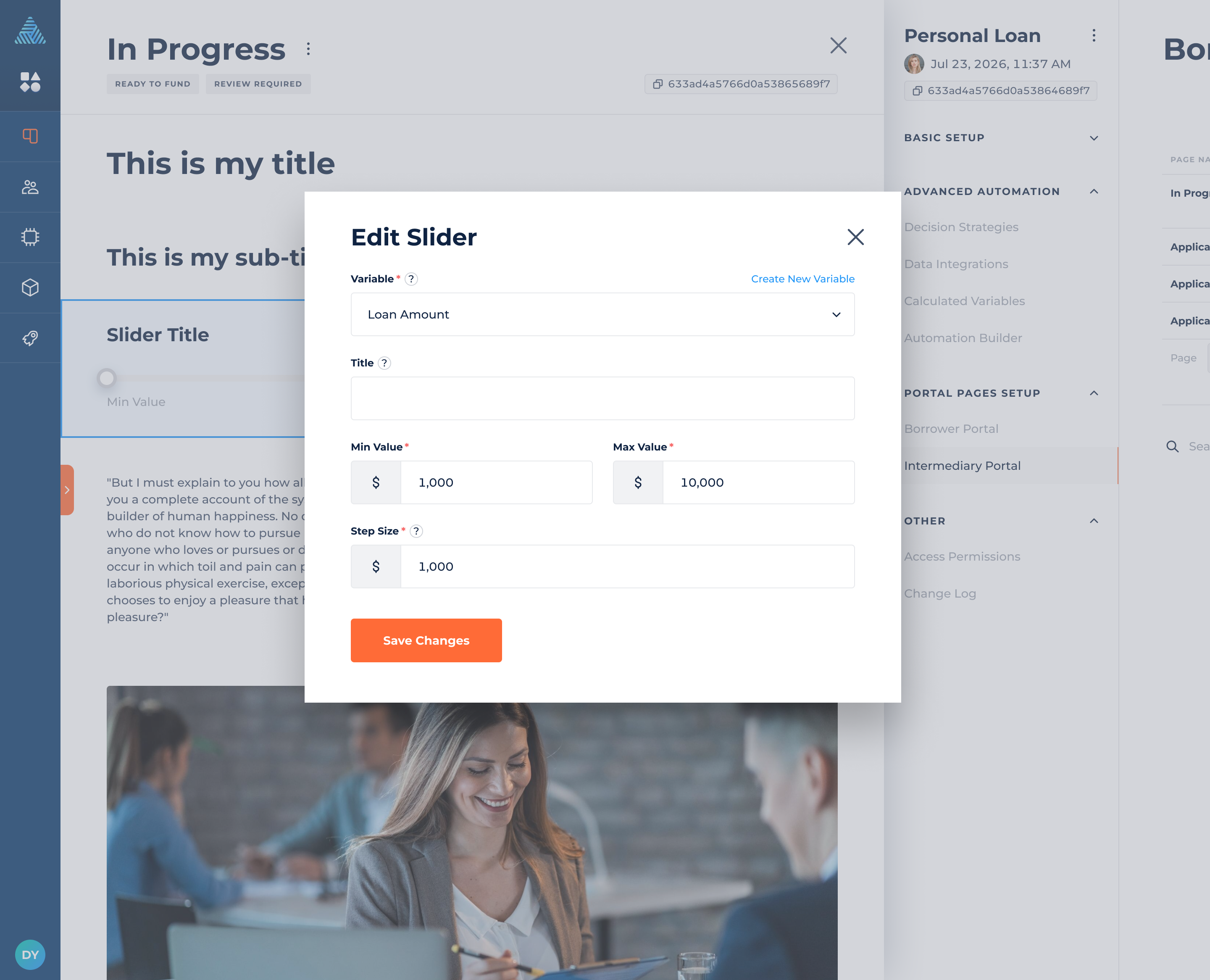 DigiFi provides an end-to-end online process for intermediaries (i.e. brokers, contractors, auto dealers, lead-gen partners, etc.), with configurable and interactive pages, so that they can submit applications on behalf of their customers. You can customize each step of the application process on the intermediary's side by adding elements to portal pages, such as tasks, text and e-signature processes.