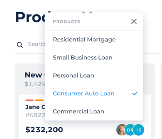 If your company has set up multiple loan products, each will receive its board and workflow. You can toggle between loan products by clicking on the product name in the header section of the page and choosing the desired option from the list.