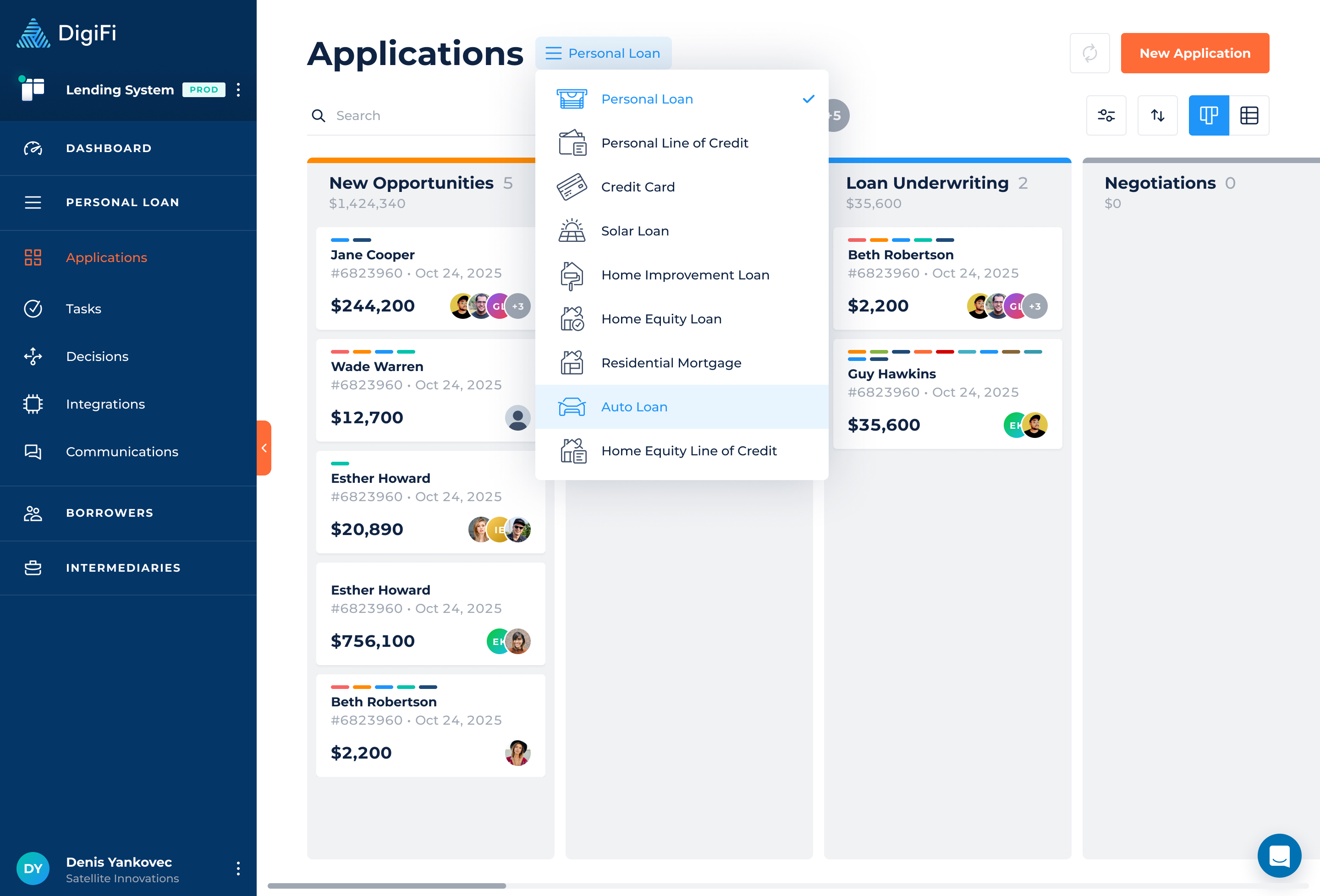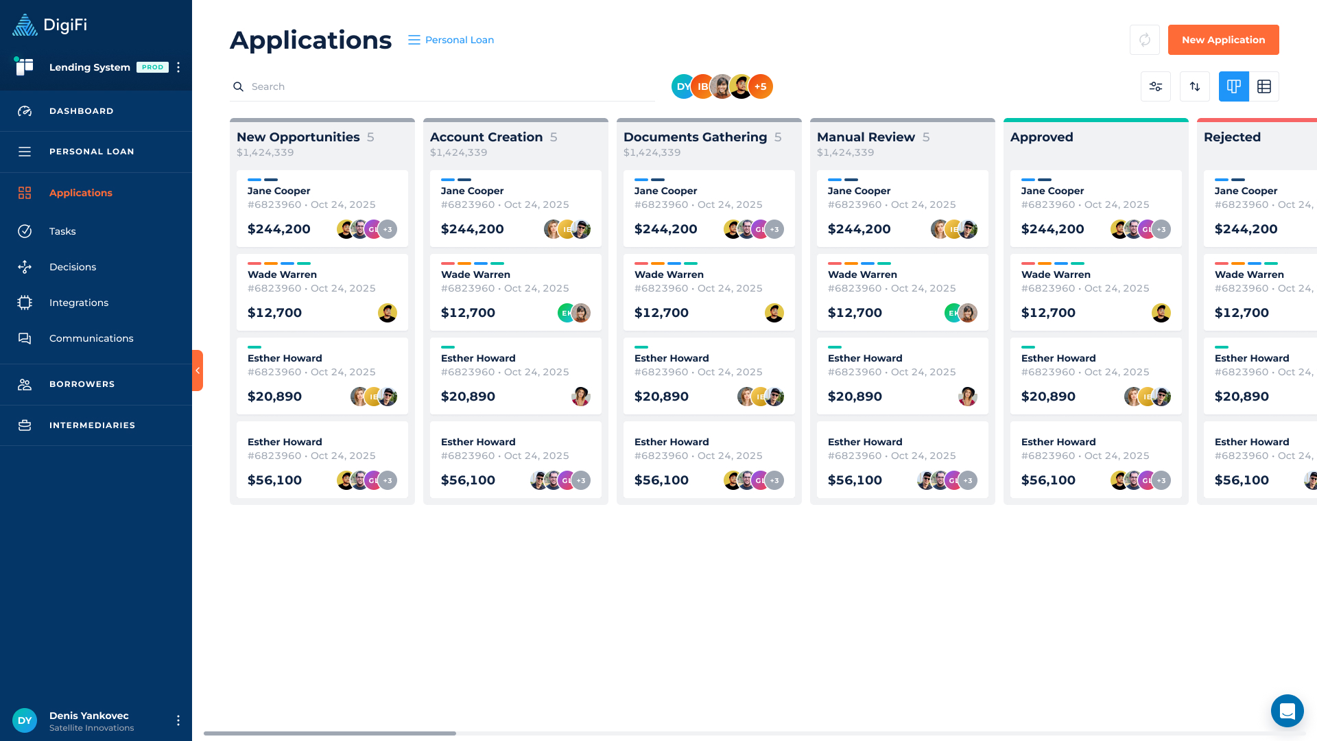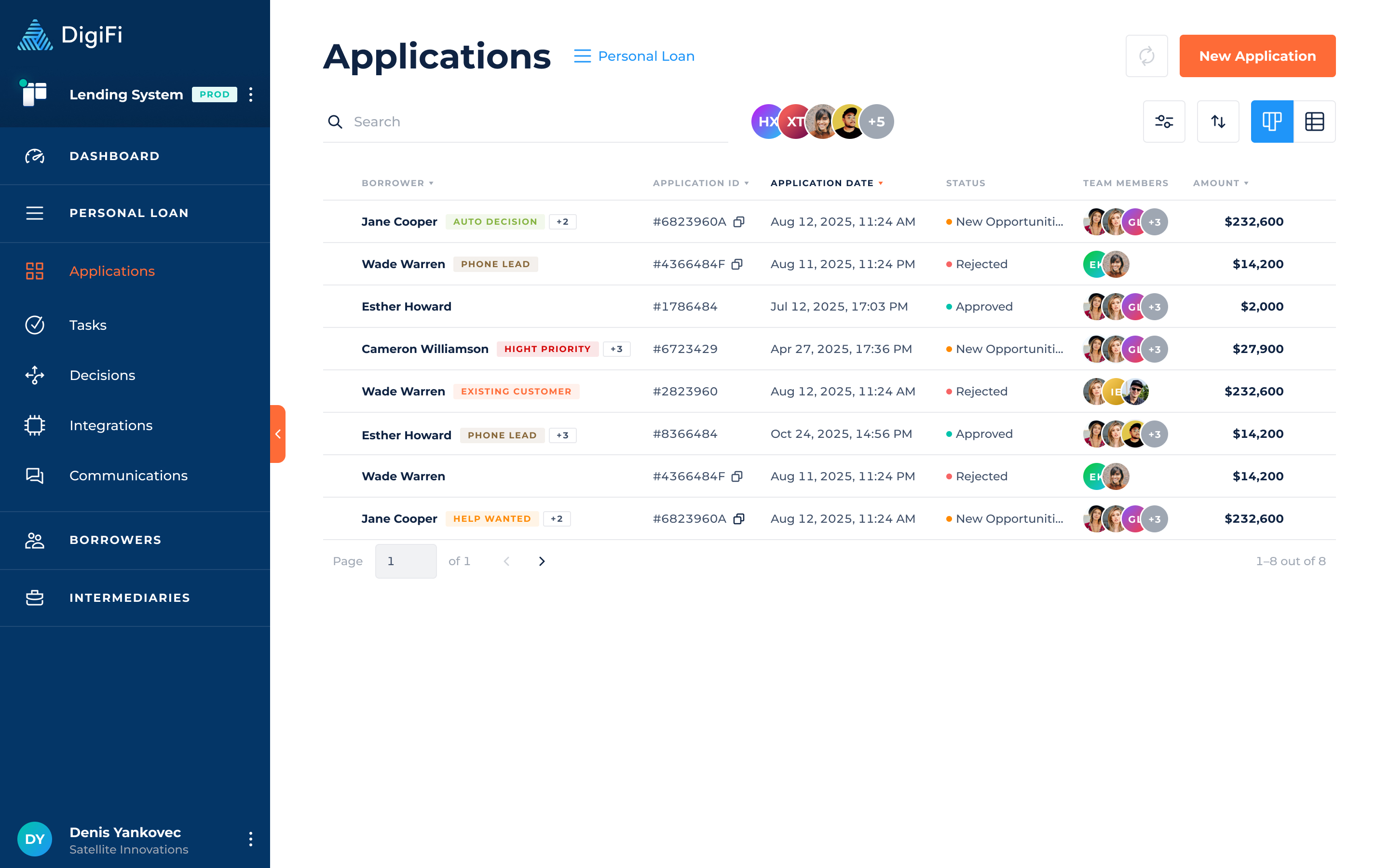 - View the borrower, co-borrower(s), loan amount, application date, assigned team members and labels for each application.